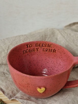 Ręcznie robiona filiżanka ceramiczna z afirmacją o pojemności 300 ml, wykonana z naturalnej gliny. Malinowy kolor oraz możliwość wyboru złotego zdobienia sprawiają, że dobrze sprawdza się do herbaty i naparów ziołowych.