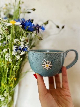 Ręcznie wykonana filiżanka ceramiczna 300 ml z kwiatem w turkusowym kolorze. Do kawy i herbaty, z afirmacją jako wariantem produktu, odpowiednia do mycia w zmywarce.