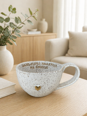 Filiżanka ceramiczna 300 ml w kolorze stracciatella z napisem „Mamo, jesteś najlepsza na świecie” to ręcznie wykonana filiżanka z afirmacją, idealna jako wyjątkowy prezent dla mamy. Złote serduszko dodaje jej elegancji i podkreśla emocjonalny charakter. Produkt dostępny od ręki – wysyłka w 24 godziny.