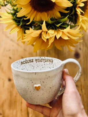 Ręcznie robiony kubek ceramiczny z afirmacją o pojemności 400 ml w wariancie stracciatella.