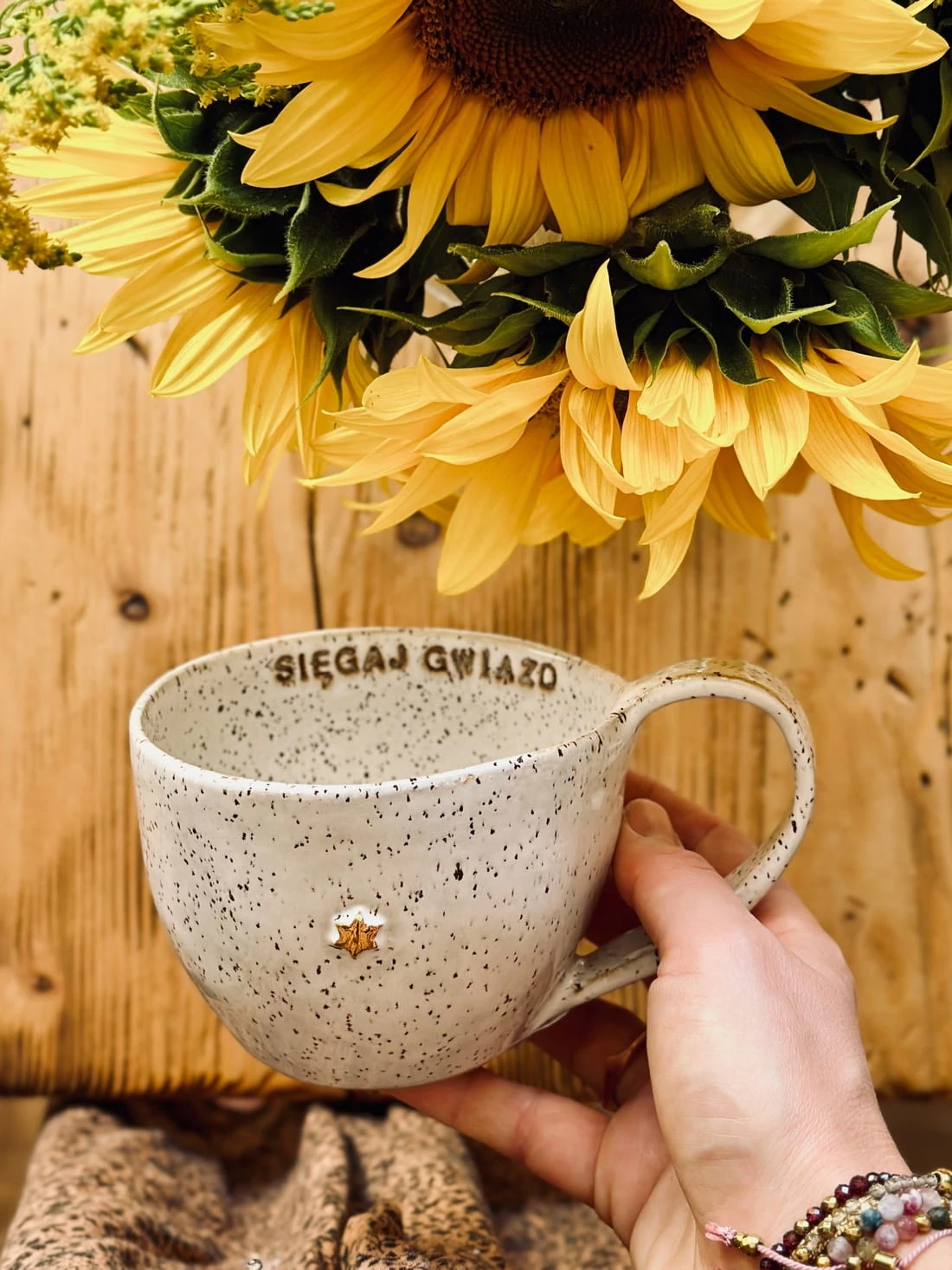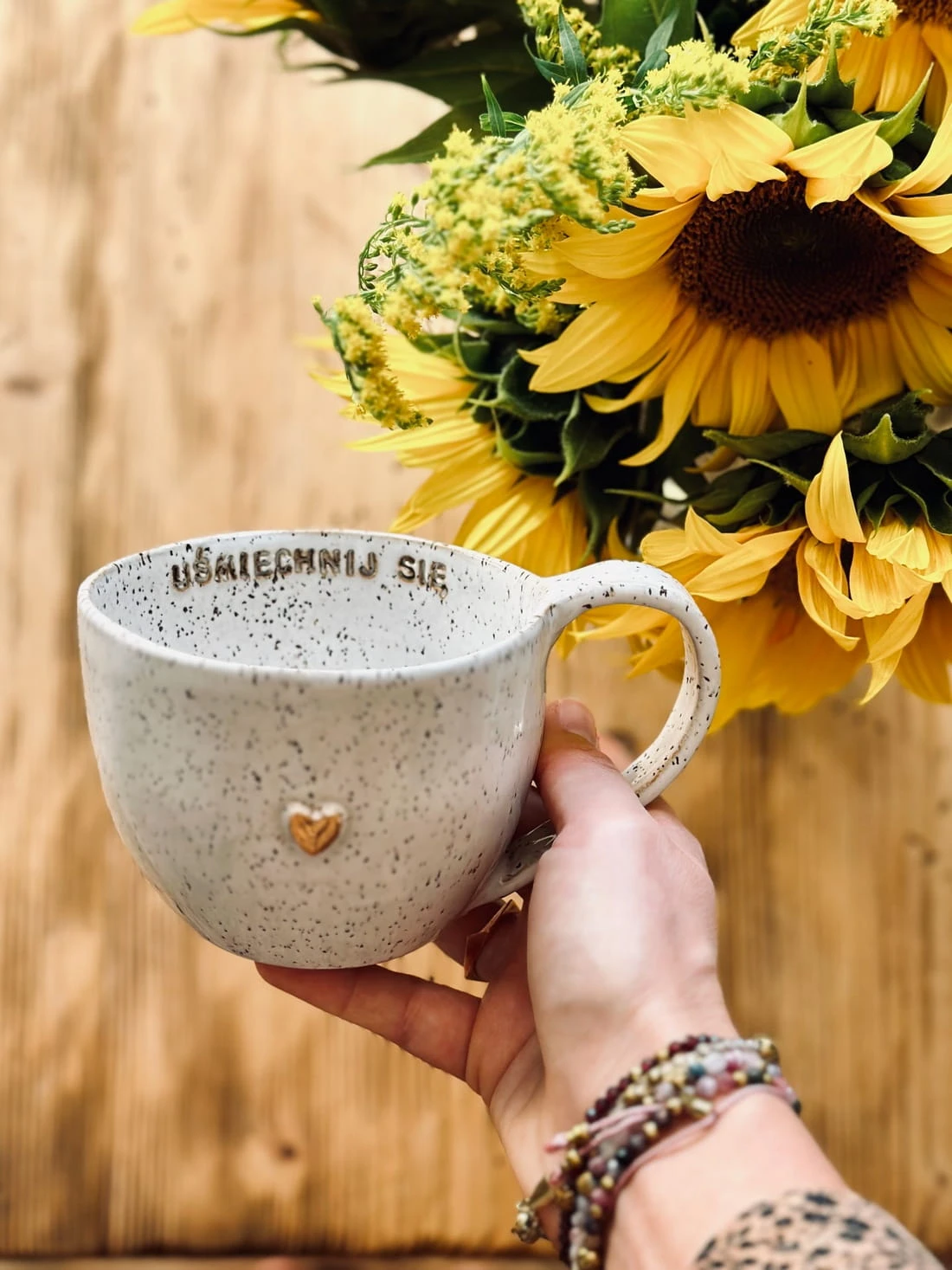 Każdy egzemplarz powstaje ręcznie w pracowni Gaja Arte, dlatego układ kropek, ich intensywność i rozmieszczenie są zawsze nieco inne. To właśnie one nadają kubkowi miękki, artystyczny charakter i sprawiają, że nie ma dwóch identycznych sztuk.
