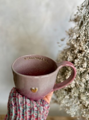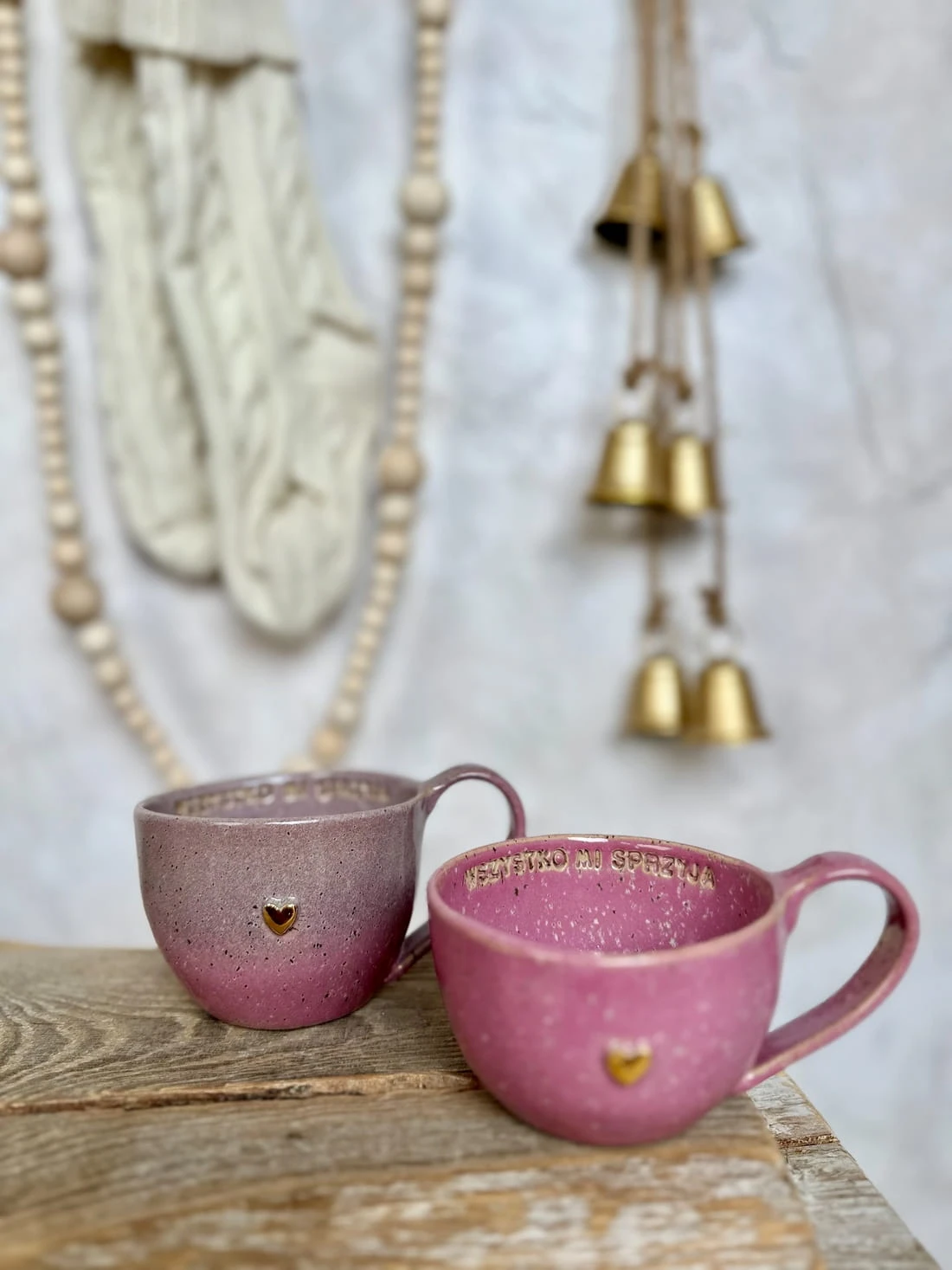 Ręcznie robiony kubek ceramiczny z afirmacją o pojemności 400 ml w delikatnym szaro-różowym kolorze.