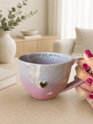 Szaro-różowy kubek ceramiczny 400 ml z napisem „Kocham Cię mamo” to ręcznie wykonany kubek z afirmacją, idealny jako prezent pełen miłości. Złote serduszko podkreśla jego elegancki, subtelny charakter. Produkt dostępny od ręki – wysyłka w 24 godziny.