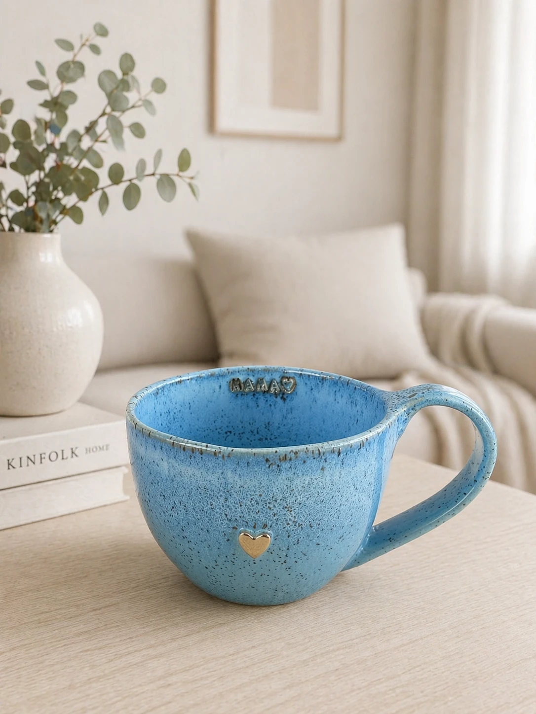 Kubek ceramiczny 400 ml w turkusowym kolorze z napisem „Mama” to ręcznie wykonany kubek z afirmacją, który łączy w sobie prostotę, emocje i codzienną przyjemność. To wyjątkowy kubek dla mamy – symbol bliskości, wdzięczności i czułości zamknięty w minimalistycznej formie.