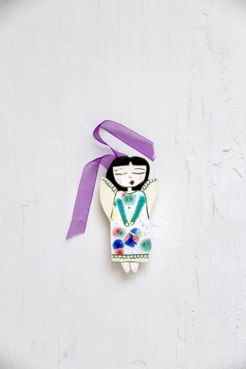 Ceramiczny anioł w kolorowej sukience. Z tyłu ma zawieszkę, dzięki której zawiesisz dekor na ścianę. Każdy dekor lepimy i malujemy ręcznie. Chcąc zamówić więcej niż jeden, pamiętaj, że będą nieznacznie się różniły.