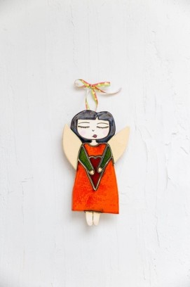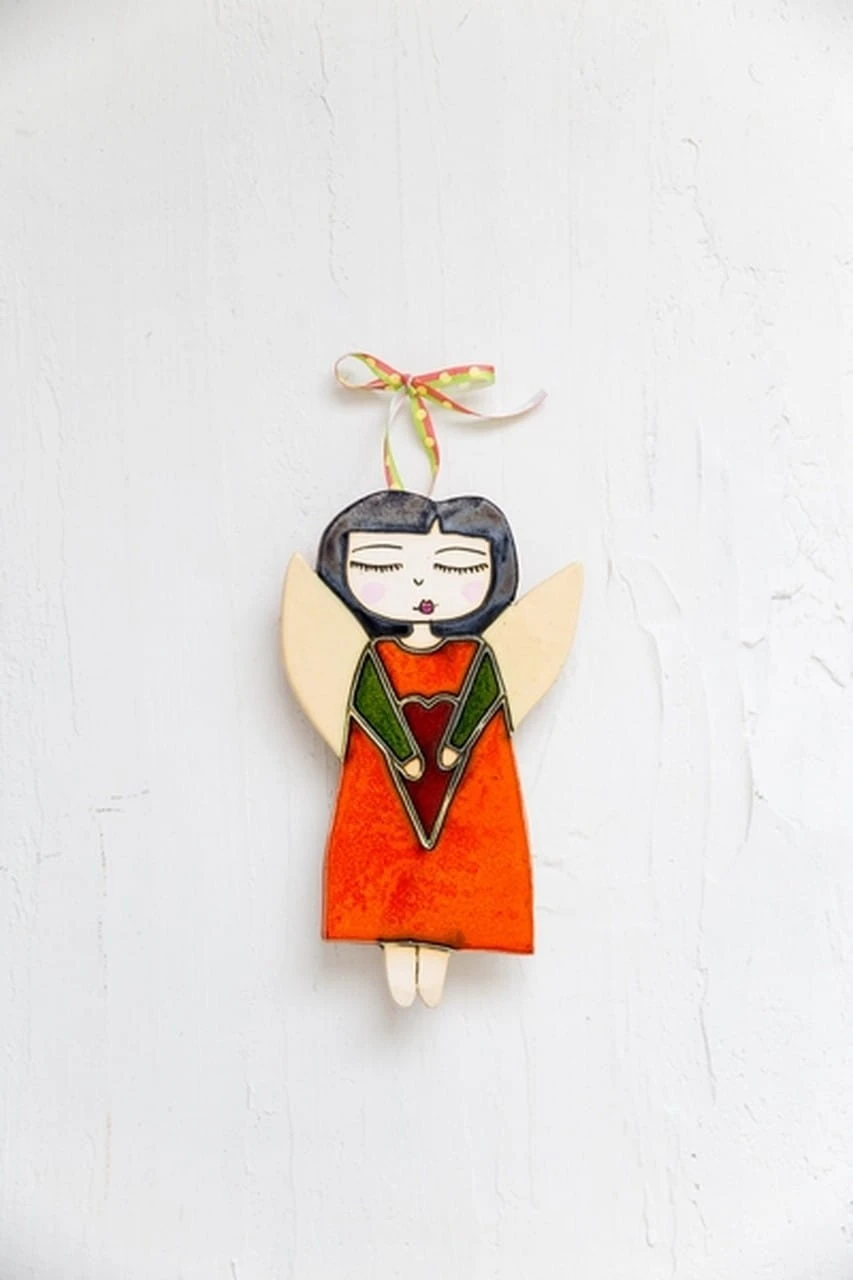 Ceramiczny anioł w pomarańczowej sukience, z serduszkiem. Z tyłu ma zawieszkę, dzięki której zawiesisz dekor na ścianę. Każdy dekor lepimy i malujemy ręcznie. Chcąc zamówić więcej niż jeden, pamiętaj, że będą nieznacznie się różniły.