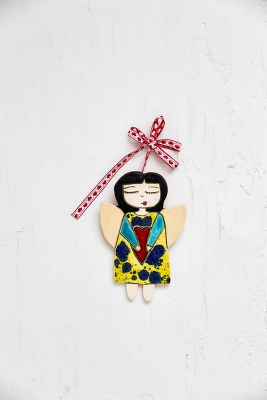 Ceramiczny anioł w żółto-granatowej sukience, trzymający serce. Z tyłu ma zawieszkę, dzięki której zawiesisz dekor na ścianę. Każdy dekor lepimy i malujemy ręcznie. Chcąc zamówić więcej niż jeden, pamiętaj, że będą nieznacznie się różniły.