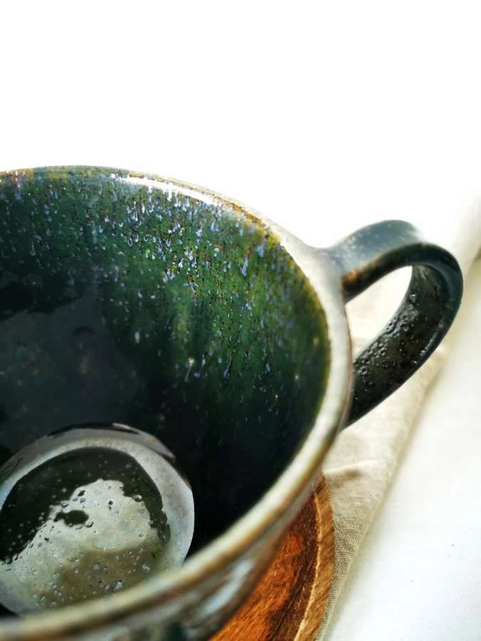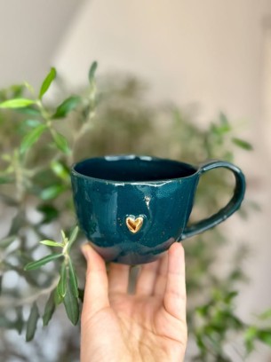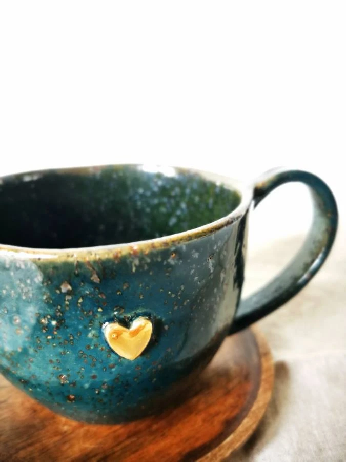Ręcznie robiony kubek ceramiczny o pojemności 400 ml w głębokim morskim odcieniu to oda do spokojnych chwil nad wodą. Złote serduszko przywołuje blask słońca odbijającego się w falach, dodając każdej kawie czy herbacie odrobiny magii. Inspirowany nadmorską paletą, ten kubek wnosi do domu atmosferę relaksu i wolności. Jego wygodny uchwyt sprawia, że idealnie nadaje się na długie rozmowy przy latte, aromatyczne napary czy gorącą czekoladę w chłodne wieczory. Stworzony z pasją w pracowni GajaArte, każda sztuka jest unikatowa, celebrując piękno niedoskonałości.