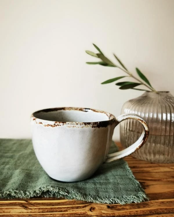 Duży kubek ceramiczny Boho o pojemności 400 mililitrów. Naczynie pokryte jest białym błyszczącym szkliwem. Rant kubka oraz brzegi ucha pomalowane są na brązowo. Spod jasnego szkliwa przebijają na wierzch brązowe kropeczki tworząc nieregularne, niepowtarzalne wzory.