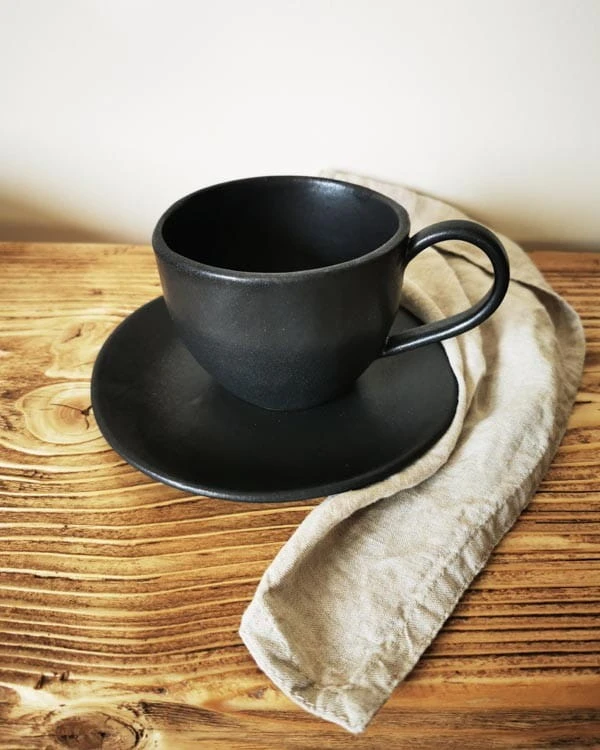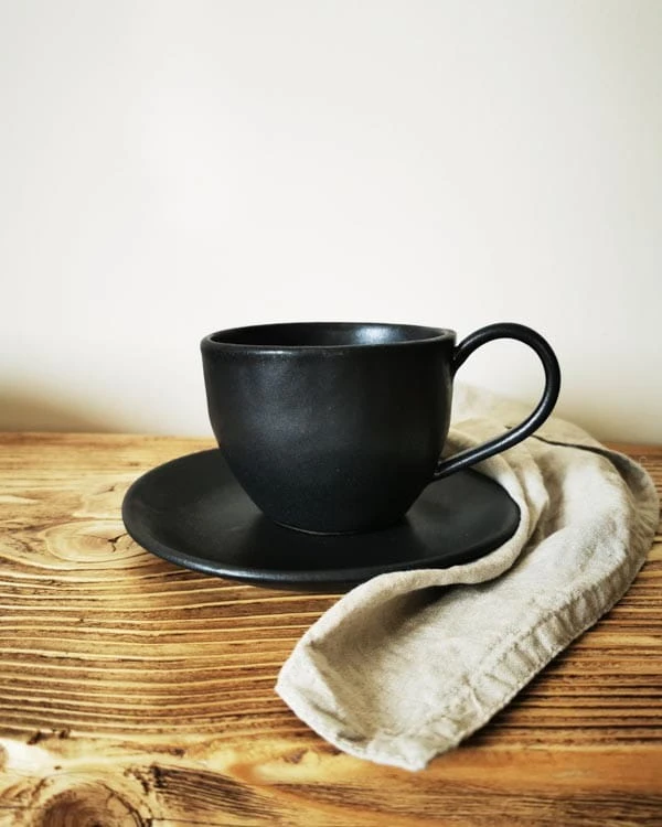Duży kubek ceramiczny ze spodkiem 400 ml z dużym uchem czarny matowy