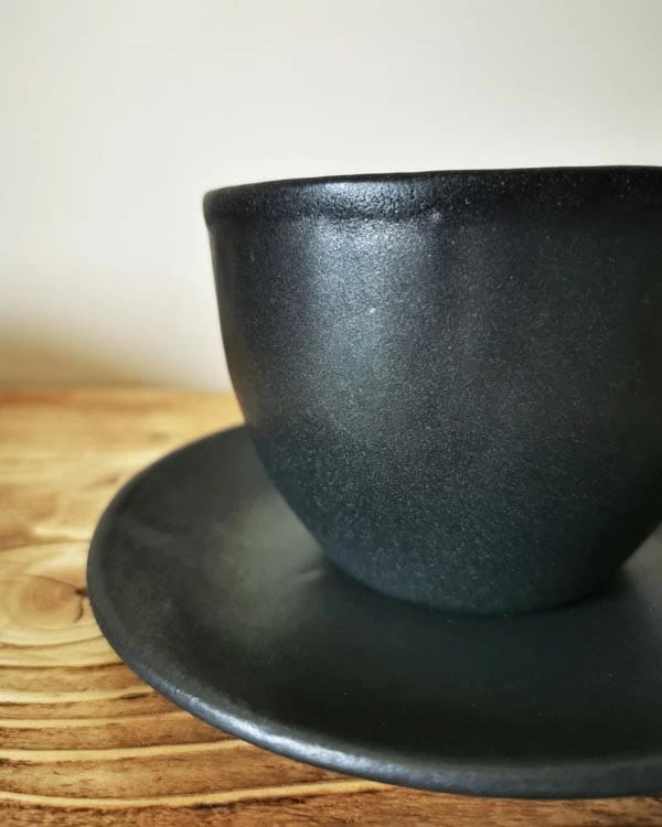 Ręcznie robiony kubek ceramiczny Smooth o pojemności 400 ml z dużym uchem i spodkiem w czarnym matowym wykończeniu to esencja nowoczesnej elegancji. Jego głęboki odcień, inspirowany nocnym niebem, wnosi do domu wyrafinowany spokój, idealny na dużą kawę z mlekiem, aromatyczną herbatę czy gorącą czekoladę. Duże ucho zapewnia wygodę, a spodek dodaje szyku, chroniąc powierzchnie i zapraszając do powolnego delektowania się napojem. Stworzony z pasją w pracowni GajaArte, ten zestaw jest unikatowy, z delikatnymi śladami rzemiosła, które podkreślają jego autentyczność.