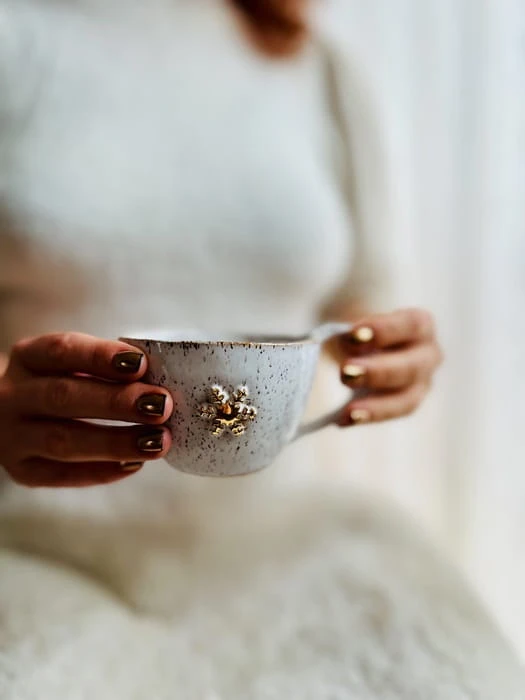 Filiżanka idealnie nadaje się na herbatę lub kawę. Filiżanka, która do Ciebie trafi lepiona jest ręcznie. Nosi ślady naszych rąk i posiada krzywizny, które przypominają o unikatowości każdej pracy, którą stworzyliśmy.
