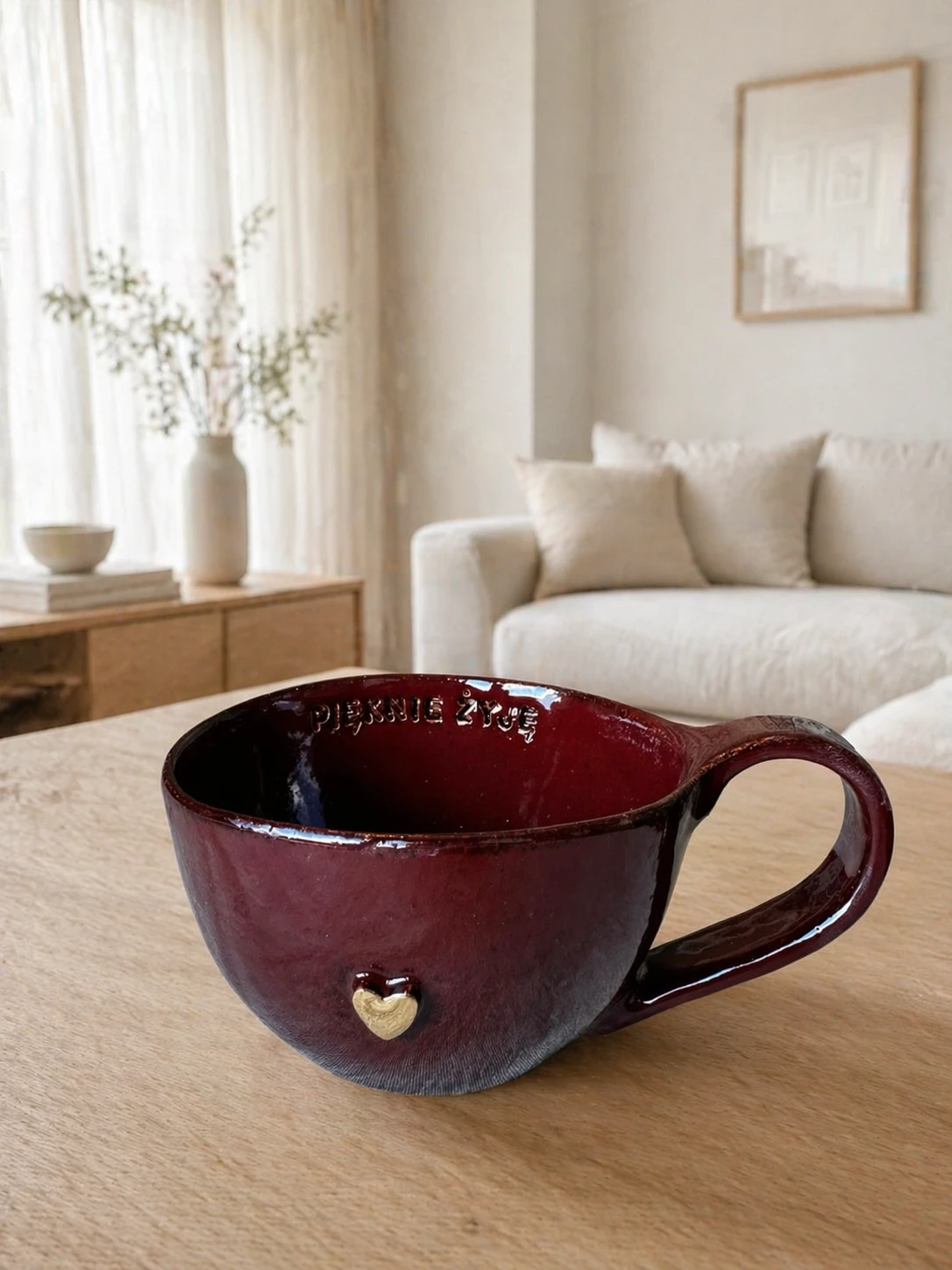 Filiżanka ceramiczna w kolorze bordowym z afirmacją "Pięknie żyję" o pojemności 300 ml. Złote zdobienie: serduszko.