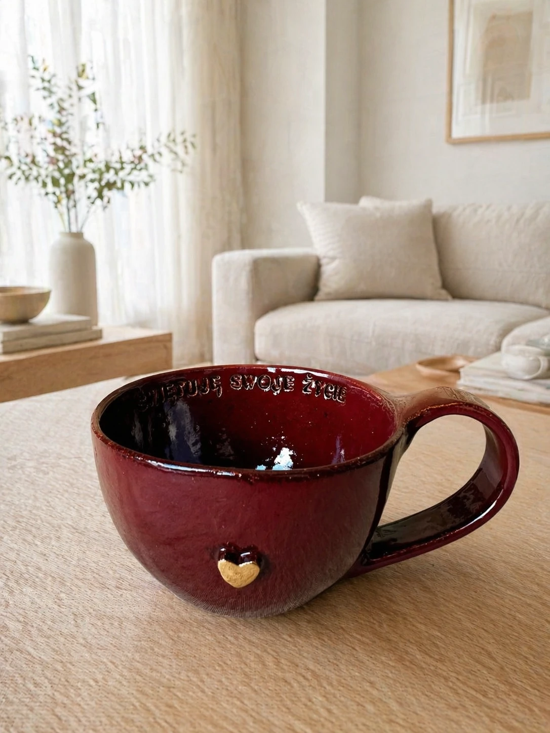 Filiżanka ceramiczna w kolorze bordowym z afirmacją "Świętuję swoje życie" o pojemności 300 ml. Złote zdobienie: serduszko.