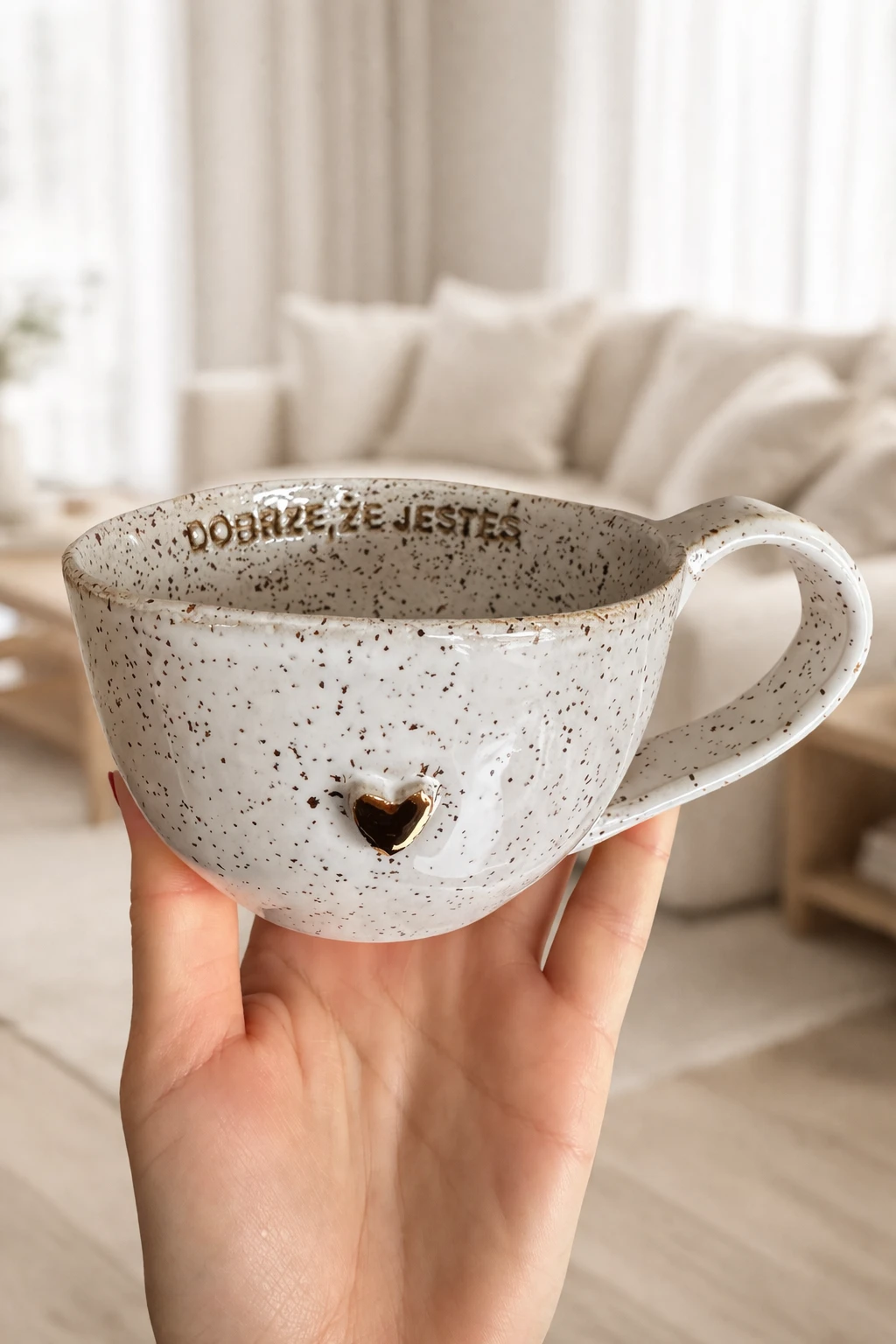 Filiżanka ceramiczna z afirmacją Dobrze, że jesteś stracciatella w pojemności 300 ml. Złote zdobienie: serduszko.