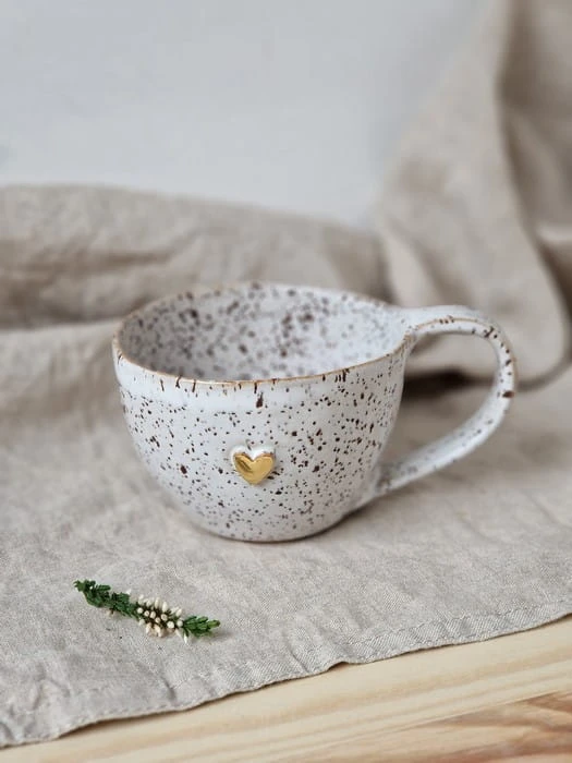 Filiżanka z kolekcji Rainbow o pojemności 200 ml, pomalowana białym błyszczącym szkliwem oraz zdobieniem w postaci złotego serduszka. Spod szkliwa przebijają czarne kropeczki. Rant filiżanki może mieć beżowe przebarwienia. W zależności od wypału, kropeczki mogą być mniej lub bardziej widoczne.