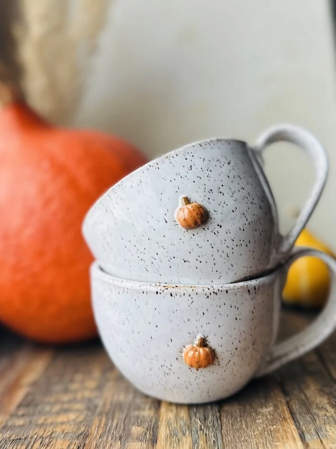 Dla tych, którzy lubią porządny łyk jesieni. Wersja 400 ml to większa, przytulna filiżanka (wręcz kubek) – idealna do pumpkin spice latte, gęstego kakao i rozgrzewających naparów. Kremowe szkliwo z charakterystycznymi „pieprzykami” i ręcznie lepiona dynia tworzą wspólnie naczynie o kojącym, sezonowym charakterze.