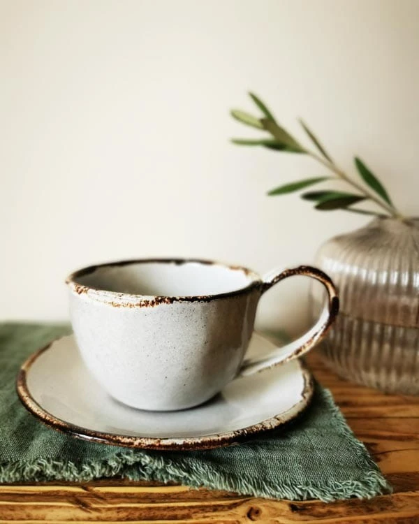 Filiżanka ceramiczna, która do Ciebie trafi lepiona jest ręcznie. Nosi ślady naszych rąk i posiada krzywizny, które przypominają o unikatowości każdej pracy, którą stworzyliśmy.
