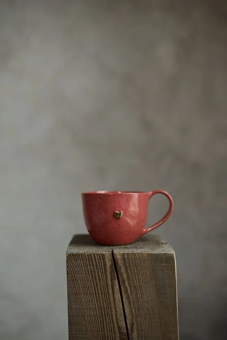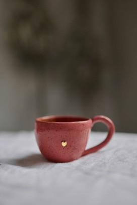 Filiżanka z kolekcji Rainbow w kolorze malinowym, ze złotym serduszkiem o pojemności około 100ml idealna na podwójne espresso. Filiżanka, która do Ciebie trafi, lepiona jest ręcznie. Nosi ślady naszych rąk i posiada krzywizny, które przypominają o unikatowości każdej pracy, którą stworzyliśmy.