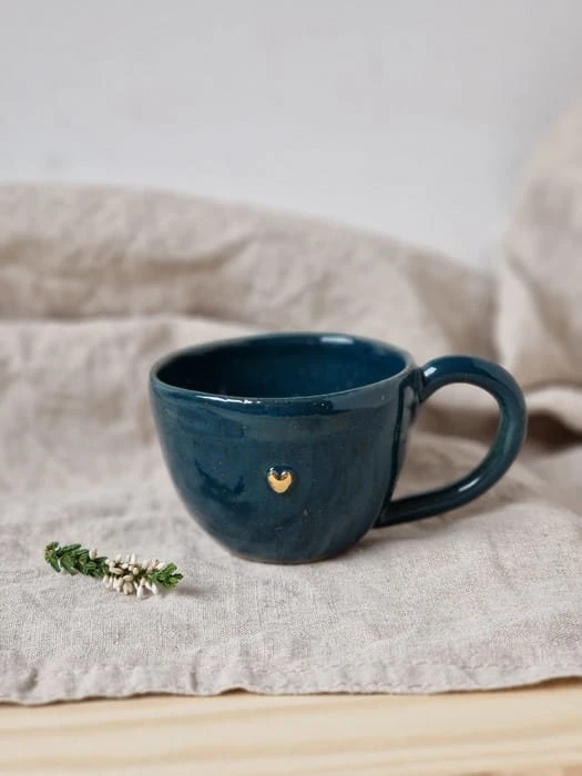 Filiżanka z kolekcji Rainbow w kolorze morskim, ze złotym serduszkiem o pojemności około 100ml idealna na podwójne espresso. Filiżanka, która do Ciebie trafi lepiona jest ręcznie. Nosi ślady naszych rąk i posiada krzywizny, które przypominają o unikatowości każdej pracy, którą stworzyliśmy.