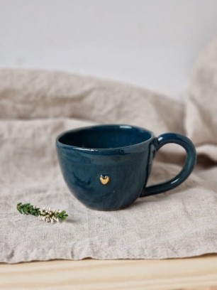 Filiżanka do espresso o pojemności 100 ml, w czarującym morskim odcieniu, wzbogaconym złotym sercem widocznym wewnątrz. Stworzona z dbałością o detale, łączy solidne wykonanie z kreatywnym wzornictwem, dzięki czemu wprowadza do Twoich codziennych kawowych rytuałów szczyptę wyrafinowanej przyjemności. Morska barwa przywodzi na myśl spokój i świeżość natury, zaś złoty akcent dodaje jej delikatnej elegancji, sprawiając, że każdy łyk kawy zyskuje wyjątkową oprawę. Ręczne wykończenie gwarantuje, że każda filiżanka jest niepowtarzalnym małym dziełem sztuki, gotowym towarzyszyć Ci od pierwszego porannego uśmiechu do ostatniej chwili wieczornego relaksu.