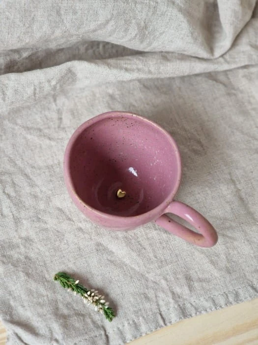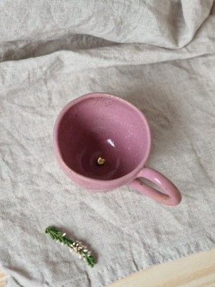 Filiżanka z kolekcji Rainbow w kolorze różowym , ze złotym serduszkiem w środku, o pojemności około 100 ml idealna na podwójne espresso. Filiżanka, która do Ciebie trafi, lepiona jest ręcznie. Nosi ślady naszych rąk i posiada krzywizny, które przypominają o unikatowości każdej pracy, którą stworzyliśmy.