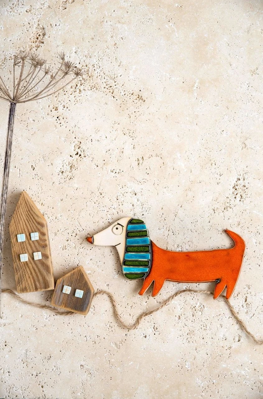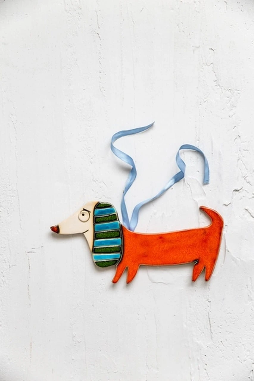Ceramiczny jamnik w kolorze pomarańczowym i niebiesko-zielonymi uszami. Z tyłu ma dwie zawieszki, dzięki którym zawiesisz dekor na ścianę. Każdy dekor lepimy i malujemy ręcznie. Chcąc zamówić więcej niż jeden, pamiętaj, że będą nieznacznie się różniły.