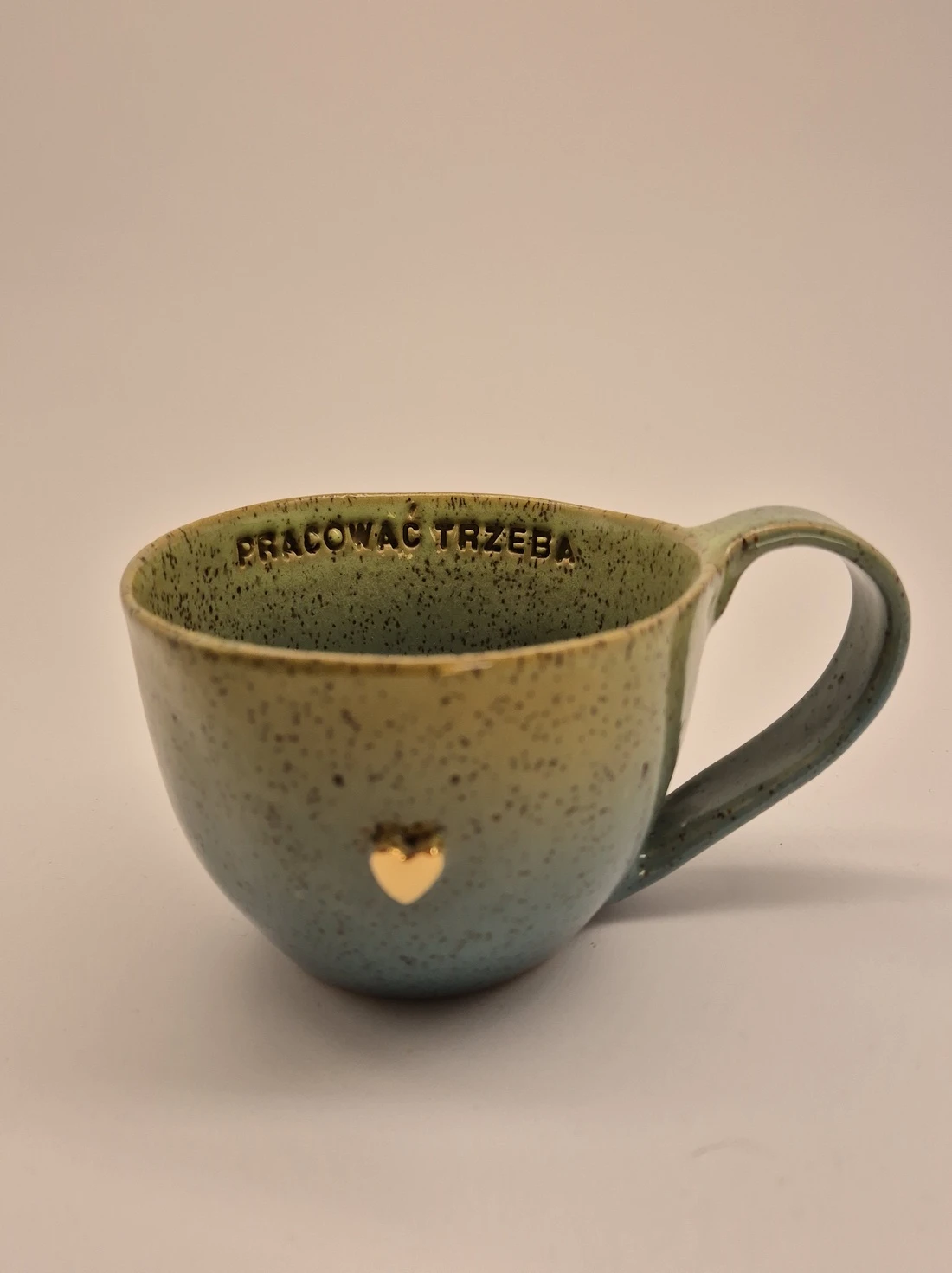 KUBEK CERAMICZNY 400 ML LIMONKOWO-TURKUSOWY Z NAPISEM - PRACOWAĆ TRZEBA