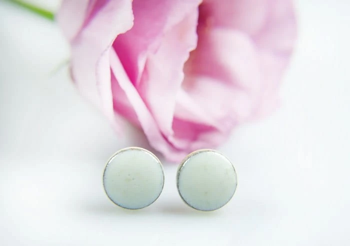 Drobne ceramiczne wkrętki do uszu w kolorze białe na brązowej glinie.