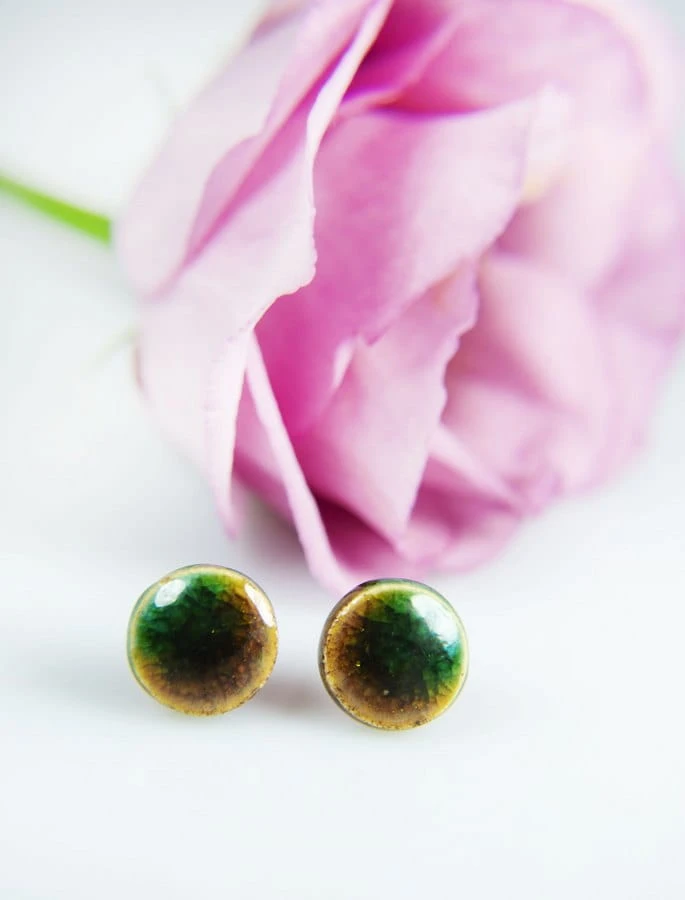 Drobne ceramiczne wkrętki do uszu w kolorze brązowo-zielone.