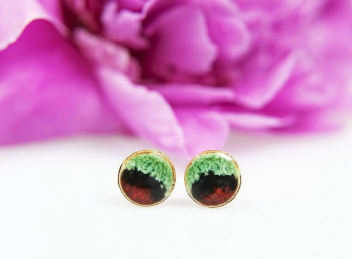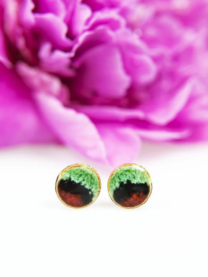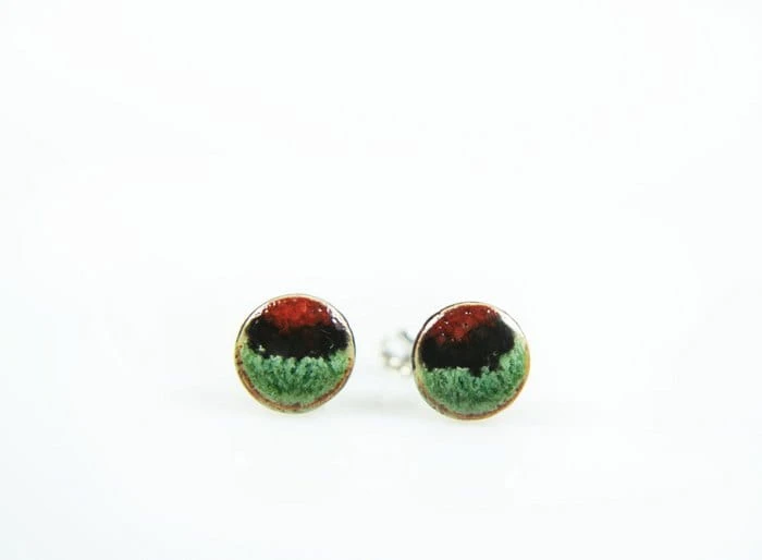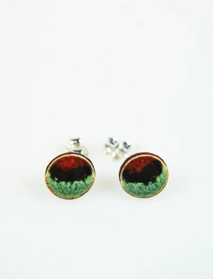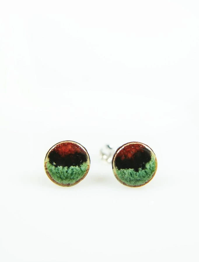 Drobne ceramiczne wkrętki do uszu w kolorze czerwono-czarno-zielone.