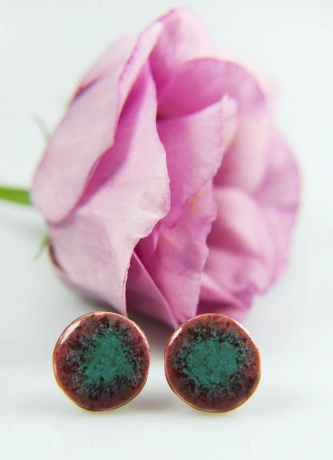 Drobne ceramiczne wkrętki do uszu w kolorze fuksja turkus.