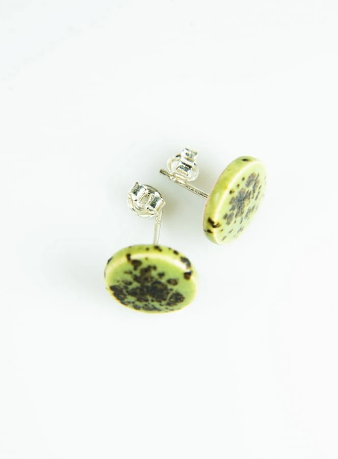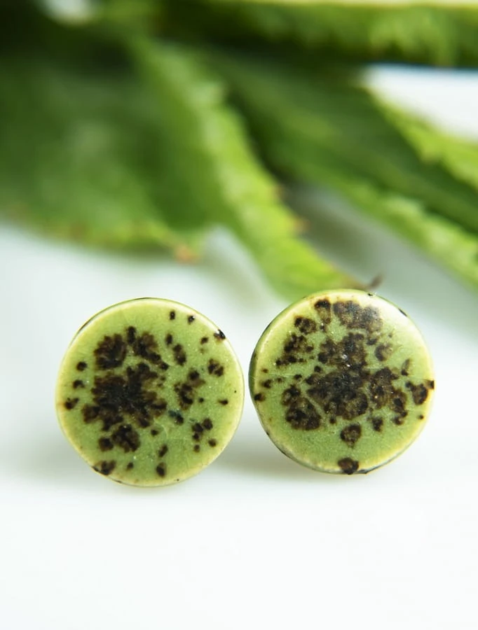 Drobne ceramiczne wkrętki do uszu w kolorze khaki nakrapianym.