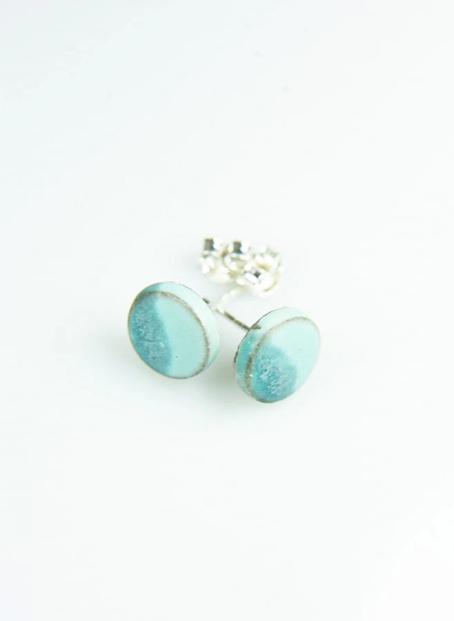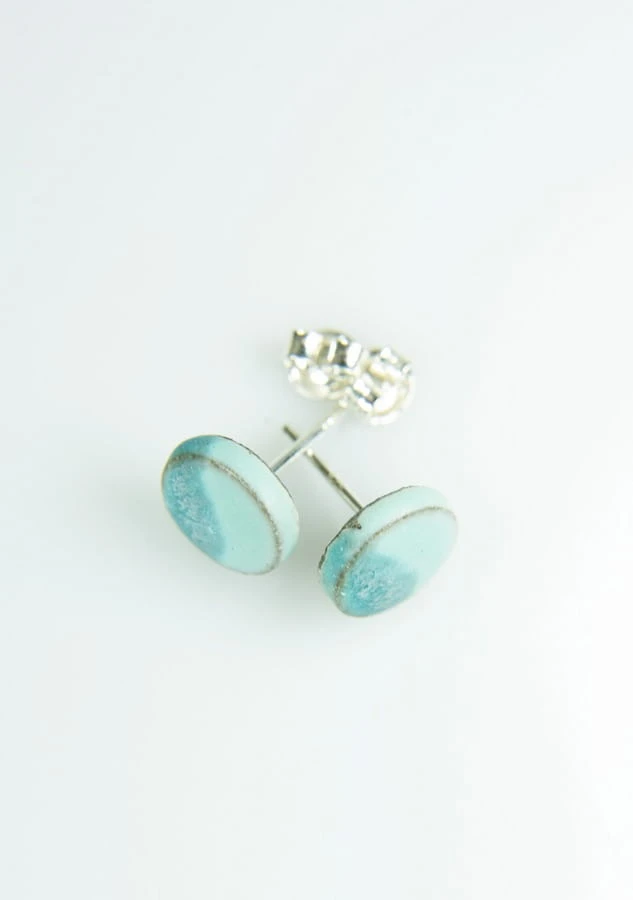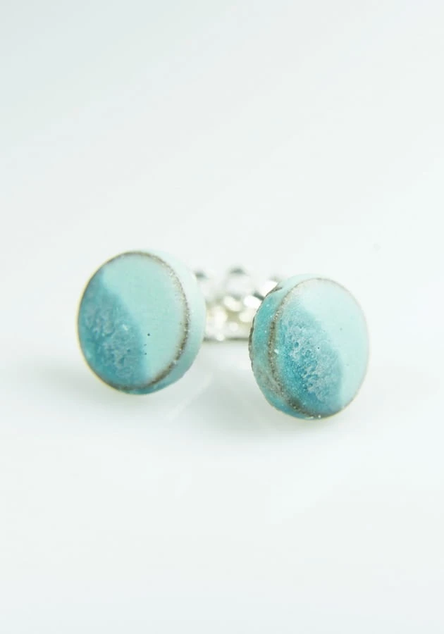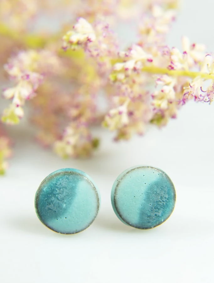 Drobne ceramiczne wkrętki do uszu w kolorze matowe błękito-niebieskie na brązowej glinie.