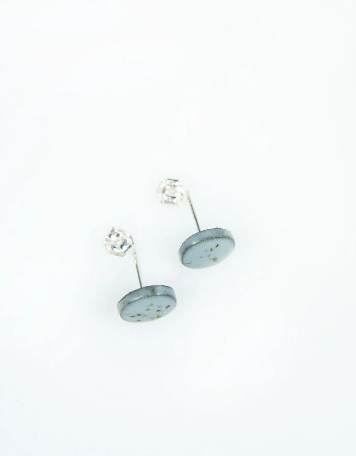 Drobne ceramiczne wkrętki do uszu w kolorze szaroniebieskim-nakrapianym.