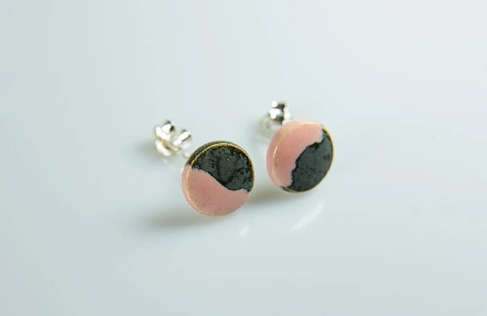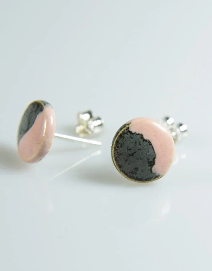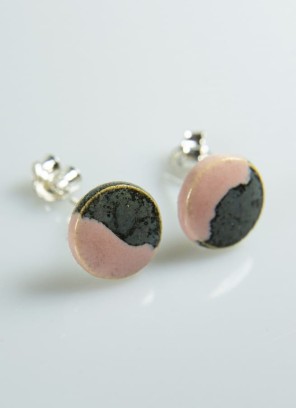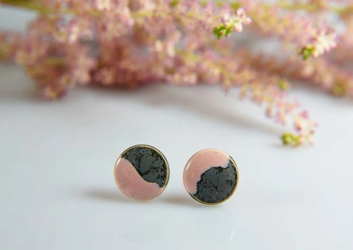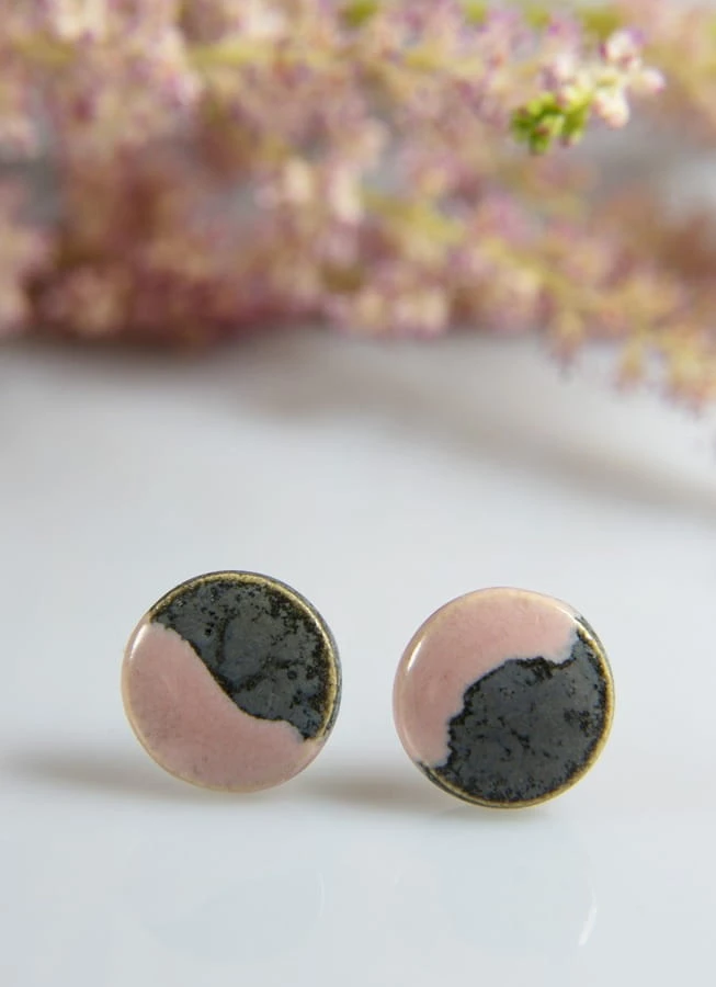 Drobne ceramiczne wkrętki do uszu w kolorze szaroróżowym.