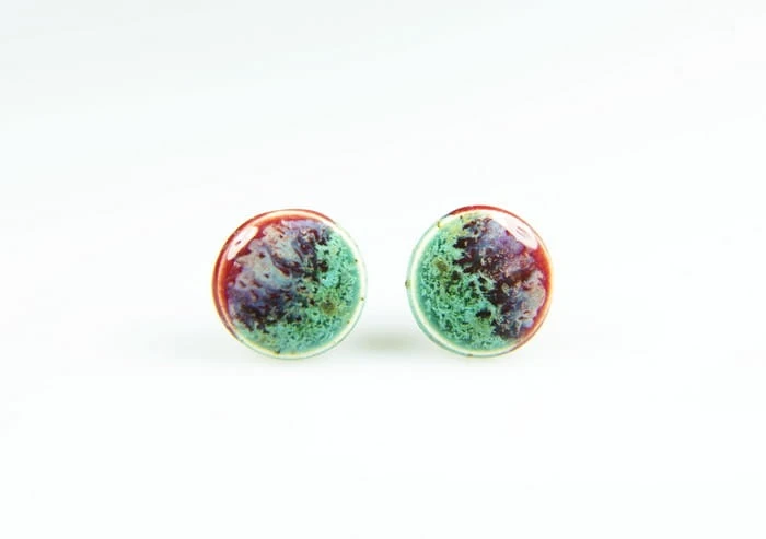 Drobne ceramiczne wkrętki do uszu w kolorze turkus-fuksja.