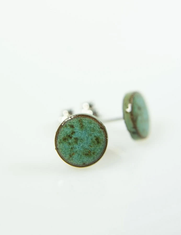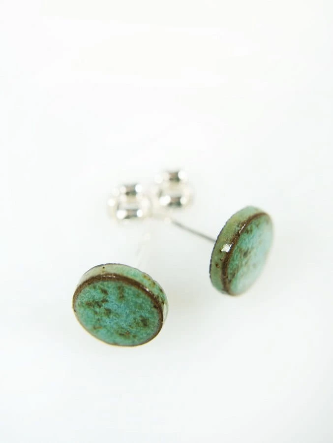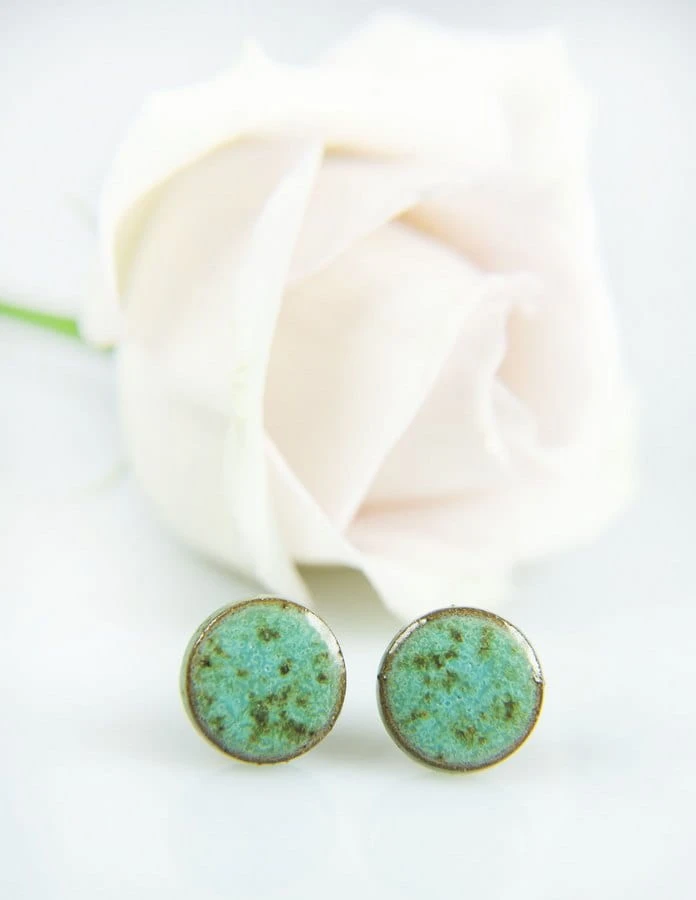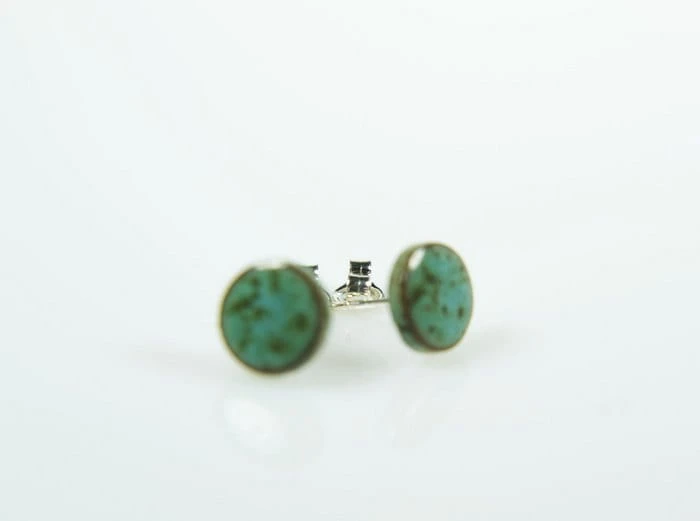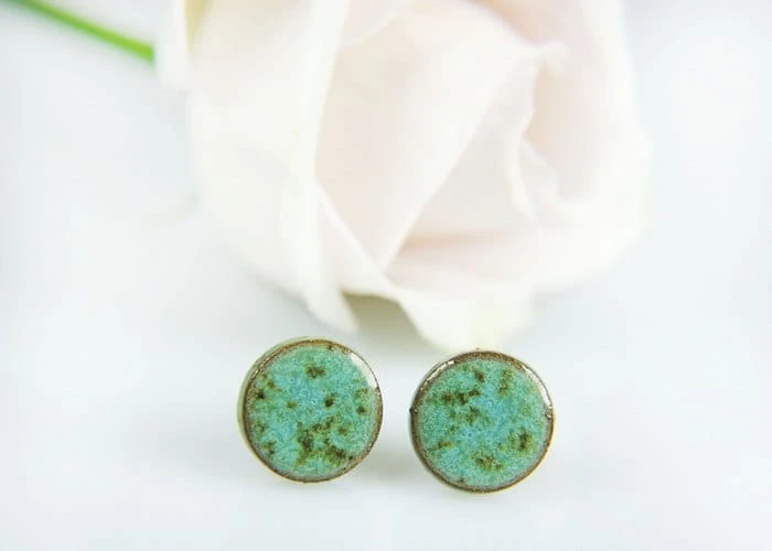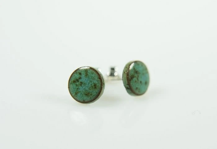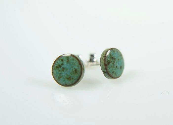 Drobne ceramiczne wkrętki do uszu w kolorze turkusowo-nakrapianym.