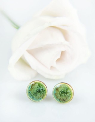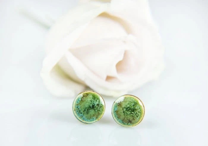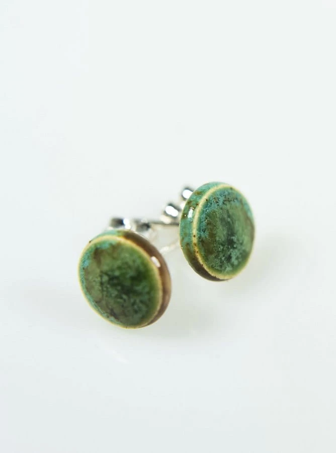Drobne ceramiczne wkrętki do uszu w kolorze zielono-turkusowym.