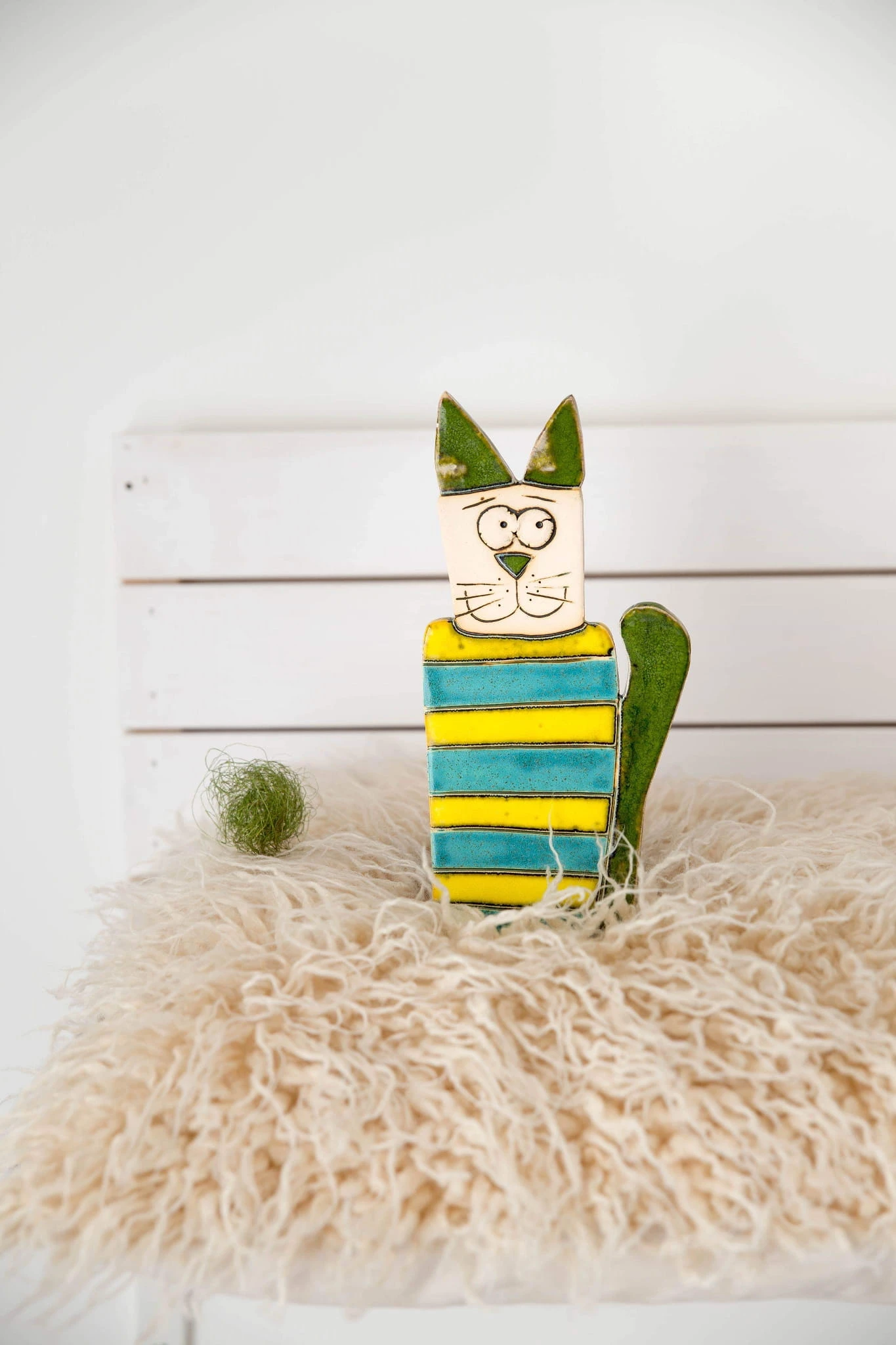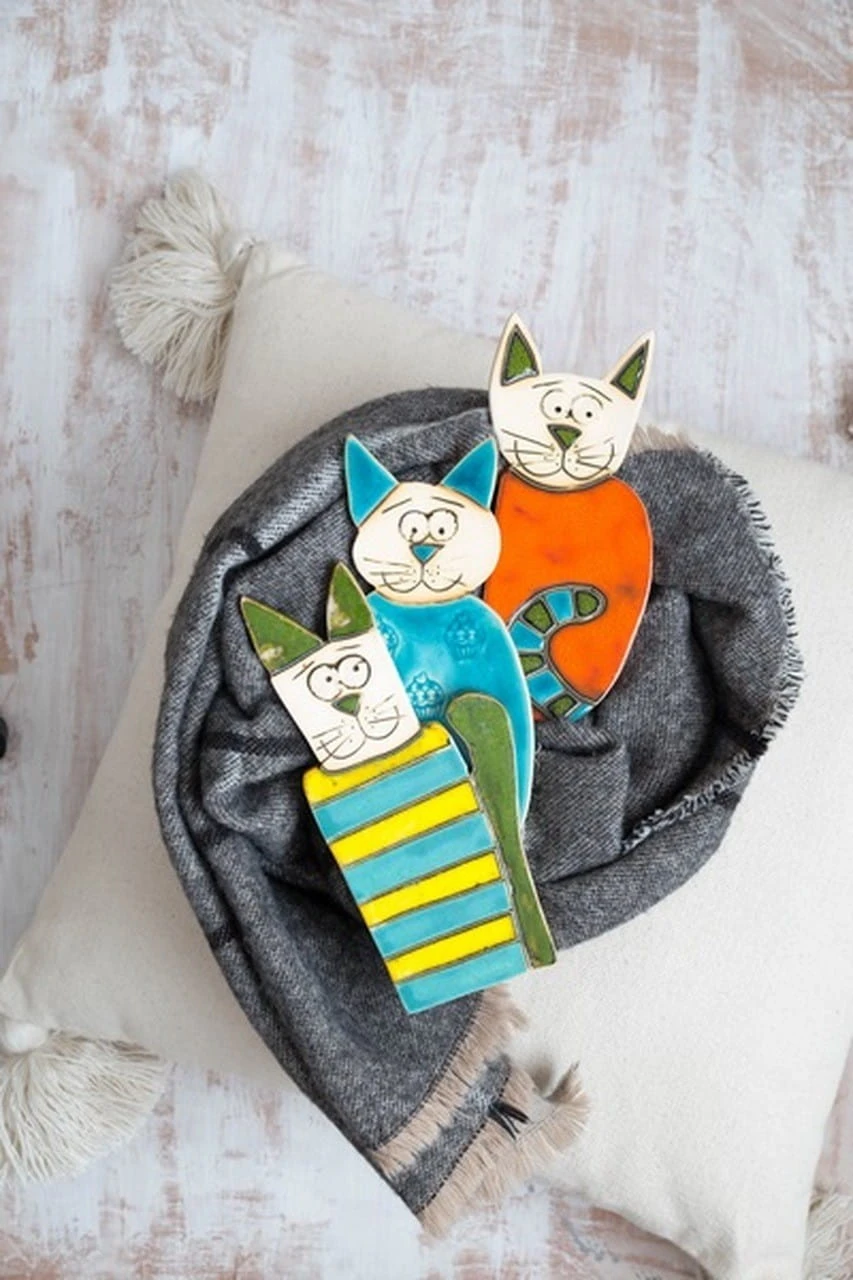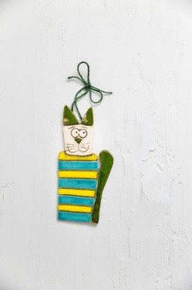 Ceramiczny kot z brzuchem w paski żółto-niebieskie, zielonym ogonem i uszami. Z tyłu ma zawieszkę, dzięki której zawiesisz dekor na ścianę. Każdy dekor lepimy i malujemy ręcznie. Chcąc zamówić więcej niż jeden, pamiętaj, że będą nieznacznie się różniły.
