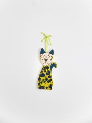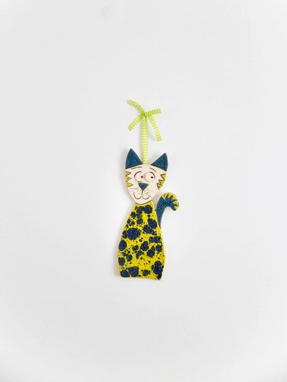 Ceramiczny kot żółto-granatowy z granatowym ogonem. Z tyłu ma zawieszkę, dzięki której zawiesisz dekor na ścianę. Każdy dekor lepimy i malujemy ręcznie. Chcąc zamówić więcej niż jeden, pamiętaj, że będą nieznacznie się różniły.