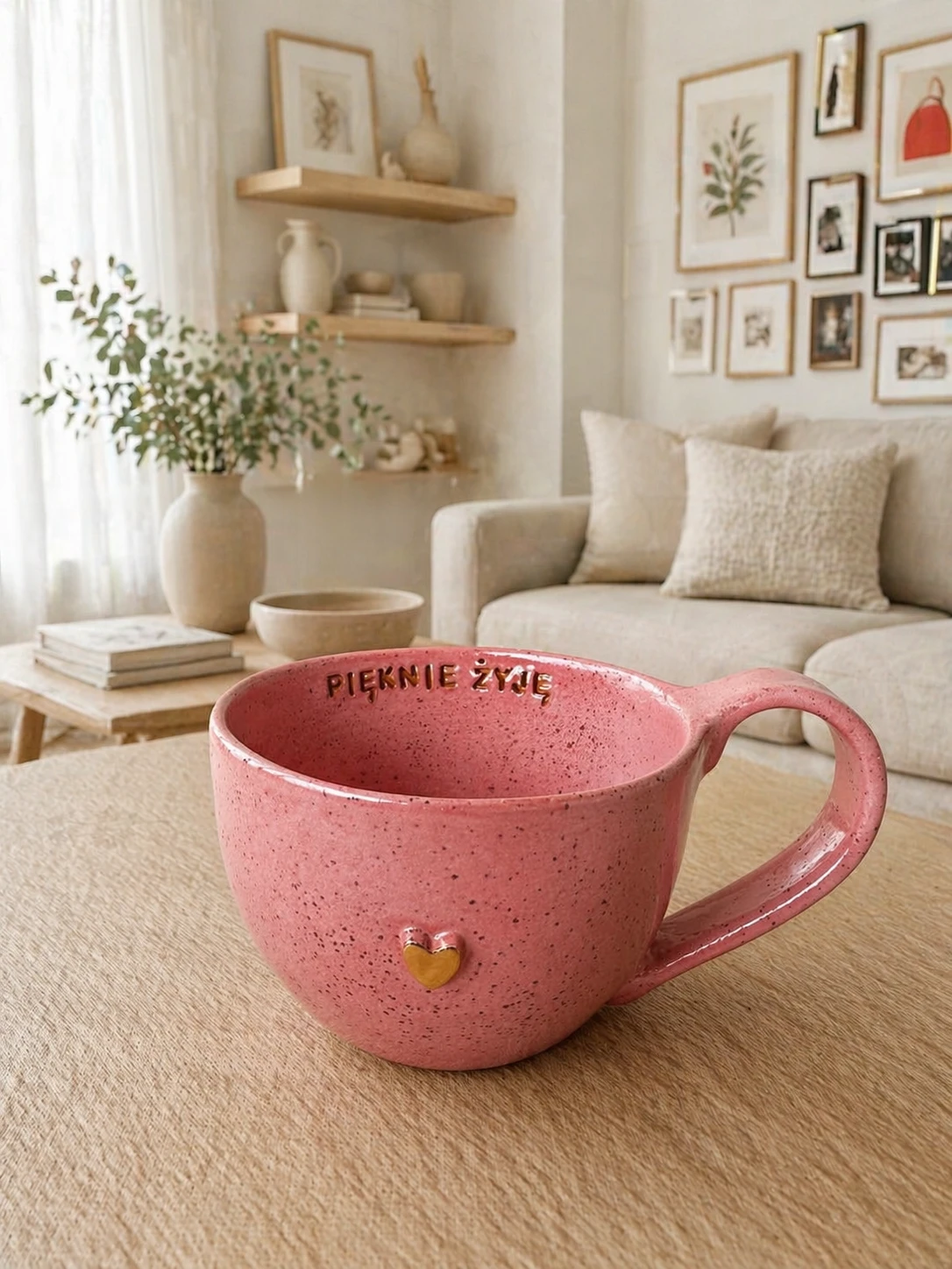 Kubek ceramiczny malinowy z afirmacją "Pięknie żyję", o pojemności 400 ml. Złote zdobienie: serduszko.