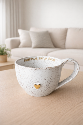 Kubek ceramiczny stracciatella z afirmacją "Świętuję swoje życie", o pojemności 400 ml. Złote zdobienie: serduszko.