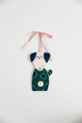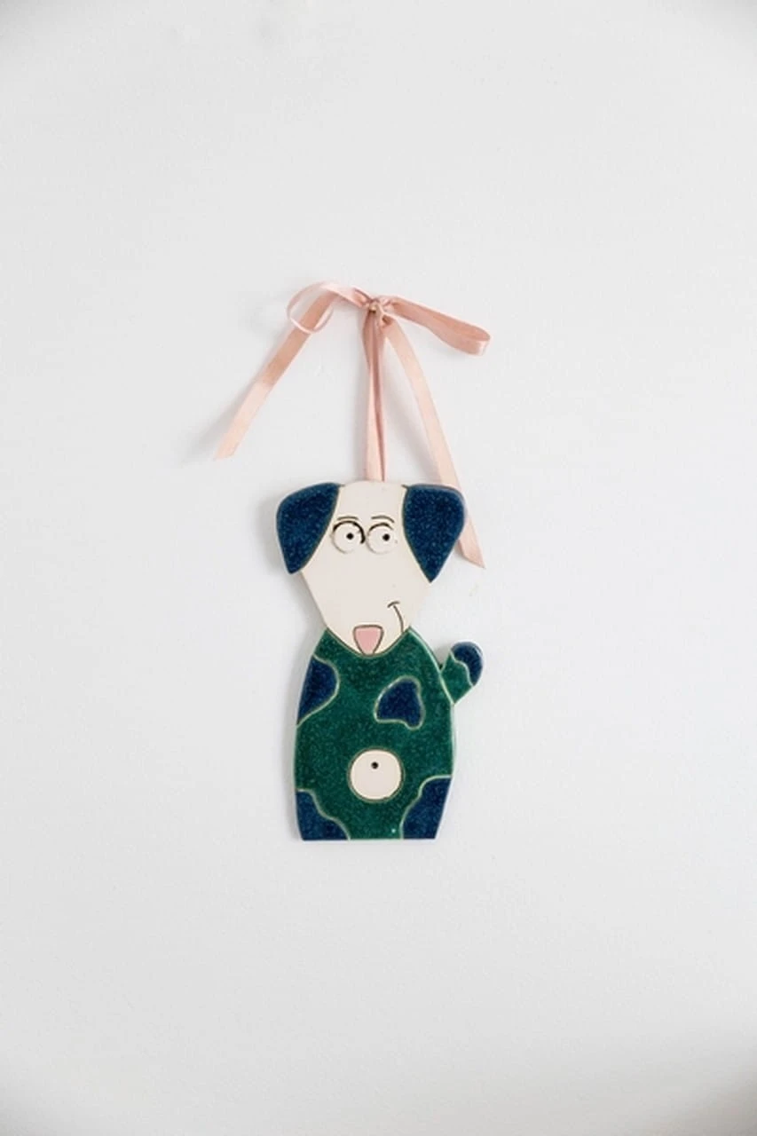 Ceramiczny pies w łatki granatowo-morskie. Z tyłu ma zawieszkę, dzięki której zawiesisz dekor na ścianę. Każdy dekor lepimy i malujemy ręcznie. Chcąc zamówić więcej niż jeden, pamiętaj, że będą nieznacznie się różniły.
