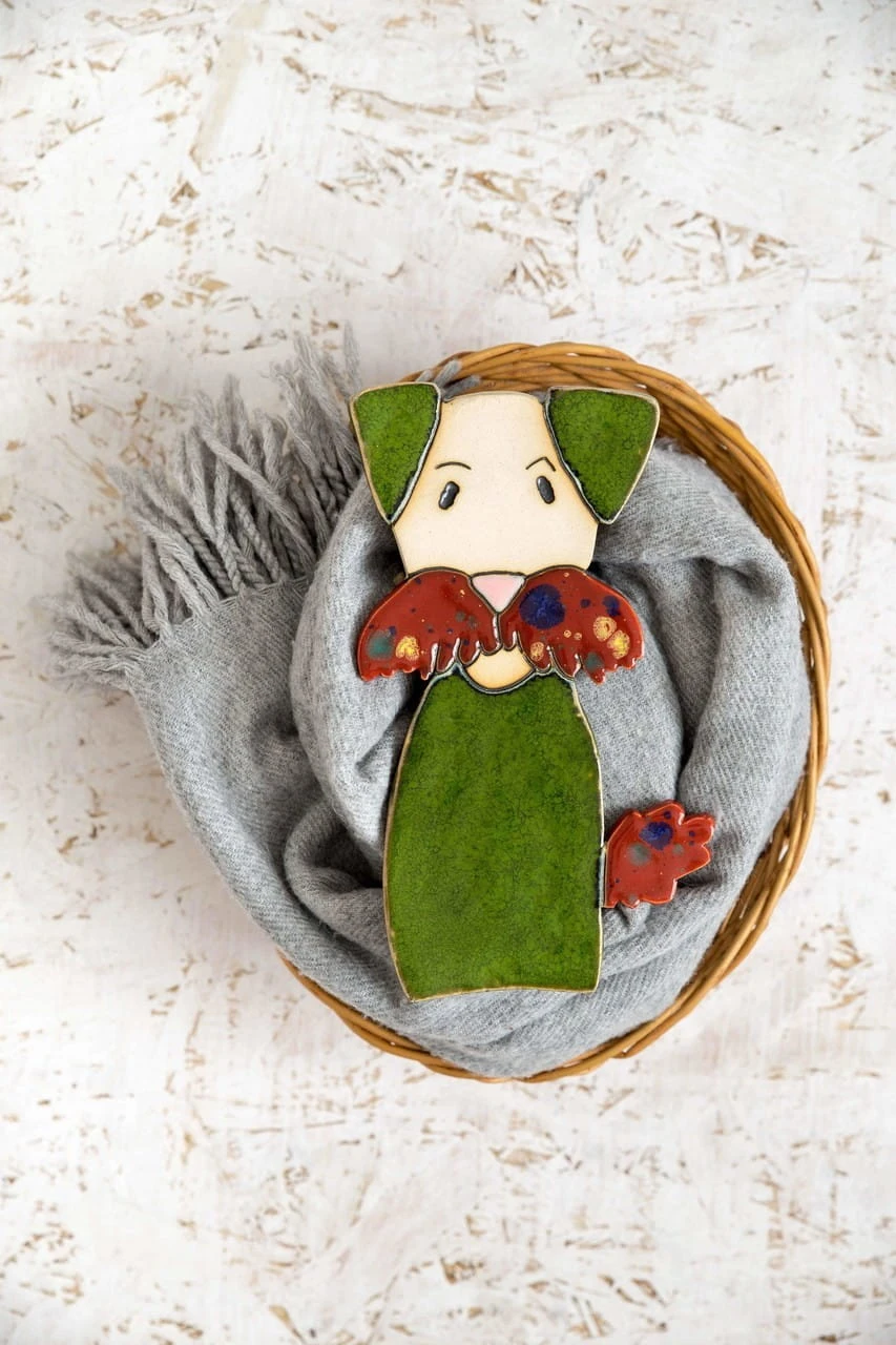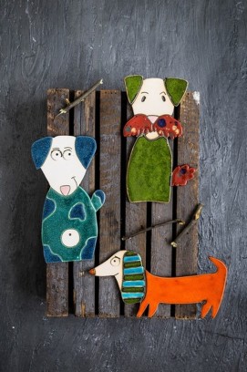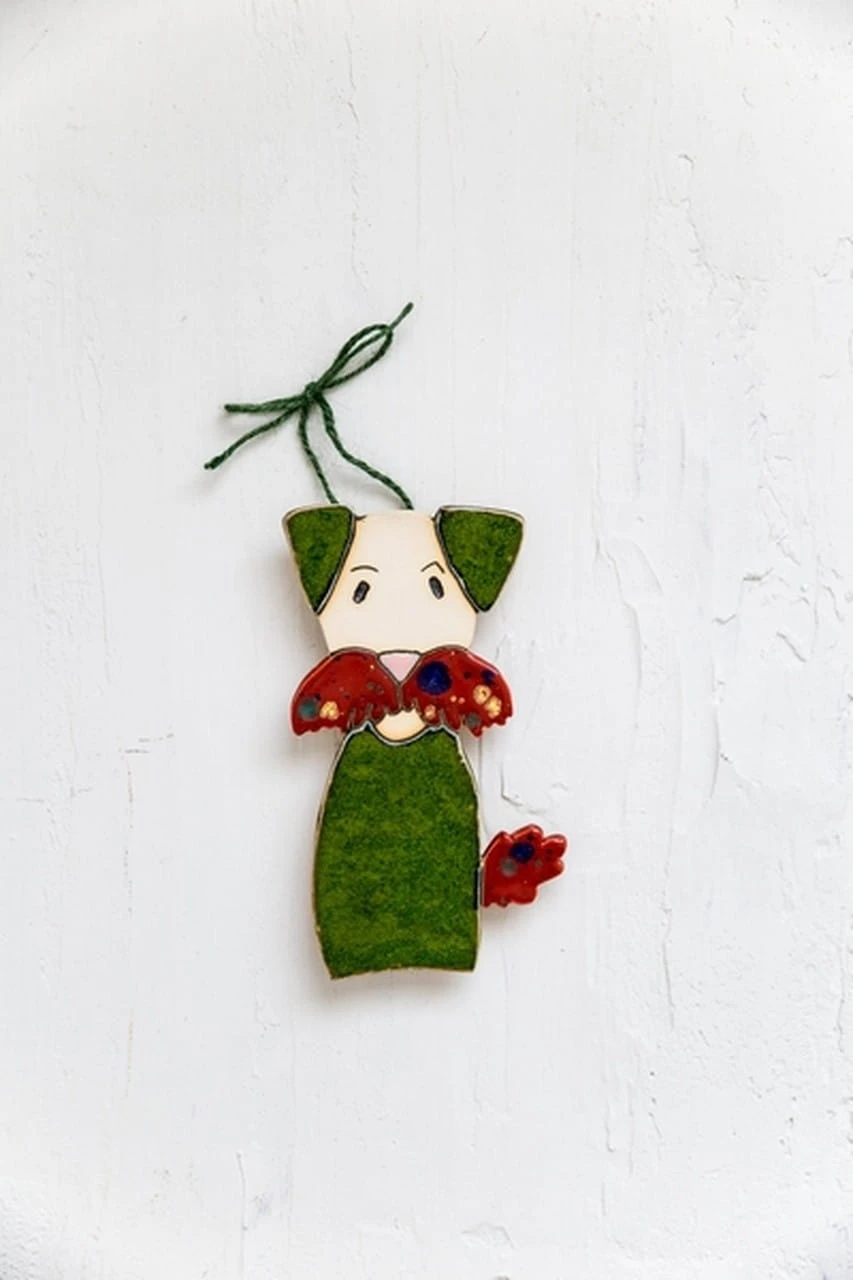 Ceramiczny zielony pies z wąsami i ogonkiem w kolorze czerwonym w kolorowe plamki. Z tyłu ma zawieszkę, dzięki której zawiesisz dekor na ścianę. Każdy dekor lepimy i malujemy ręcznie. Chcąc zamówić więcej niż jeden, pamiętaj, że będą nieznacznie się różniły.